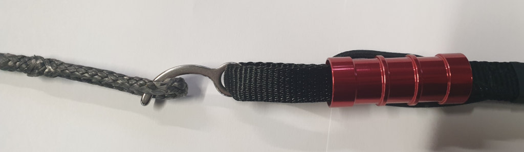 It is used with a short length of non stretch line (we use Dyneema) with smooth splicing at each end so as to run easily through the ring at the end of the tow line. This forms an inverted 'V' shape with one end attached to each harness shoulder tow loop.